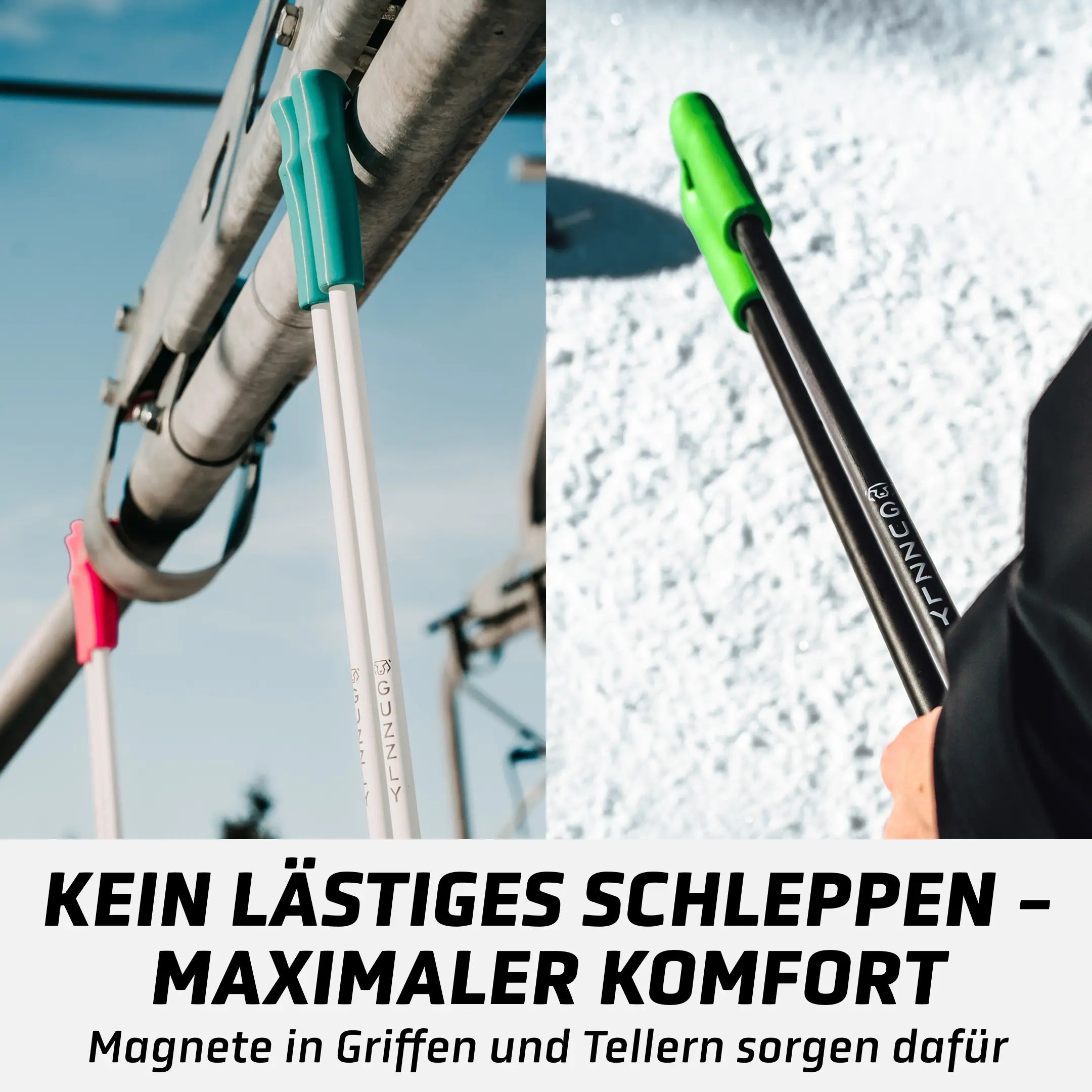 Die Magnetfunktion unserer Griffe dient der praktischen Befestigung an statischen, metallischen Oberflächen. Wir garantieren nicht, dass die Stöcke sicher an einem Skilift hängen bleiben. Bitte achten Sie darauf, dass die Stöcke während der Liftfahrt immer stabil sind, um Unfälle oder Schäden zu vermeiden.